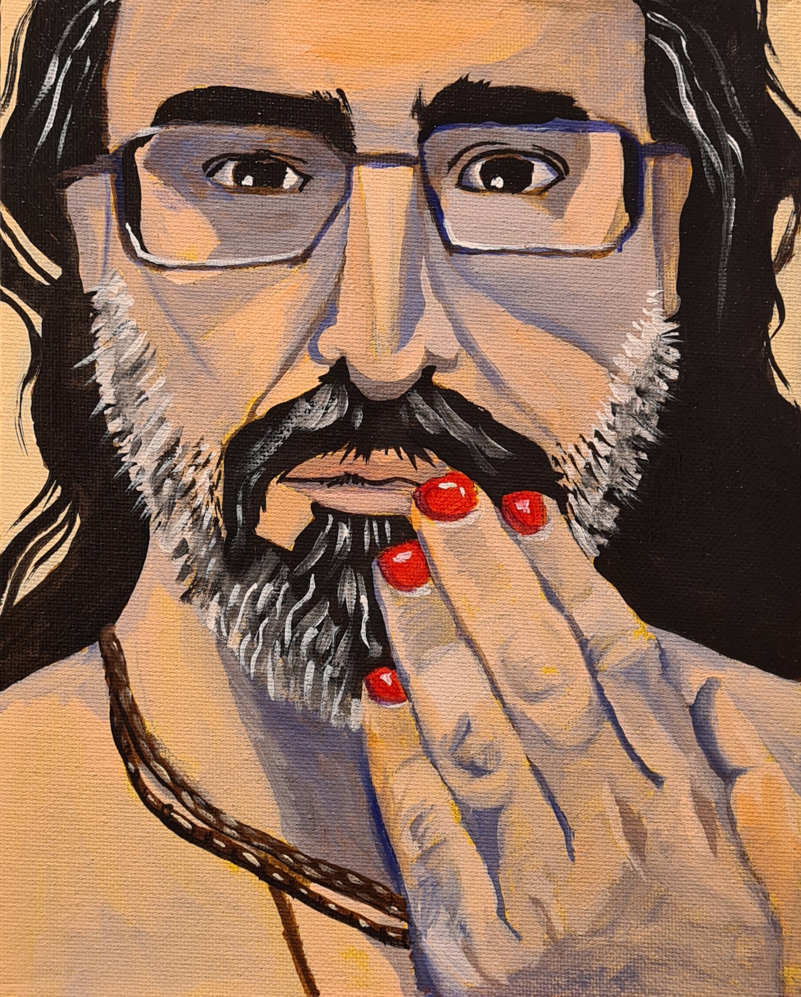 Self-Portrait with Red Nail Polish (2025) is an intimate and direct acrylic painting that explores identity, self-observation, and the tension between masculinity and sensitivity. The portrait focuses on the face and the gesture of the hand, with the red nail polish acting as a sharp, emotionally charged accent that disrupts expectations and adds a layer of personal, courageous expression. Visible brushstrokes and a warm color palette give the work a sense of honesty and human presence, inviting quiet yet unsettling contemplation.