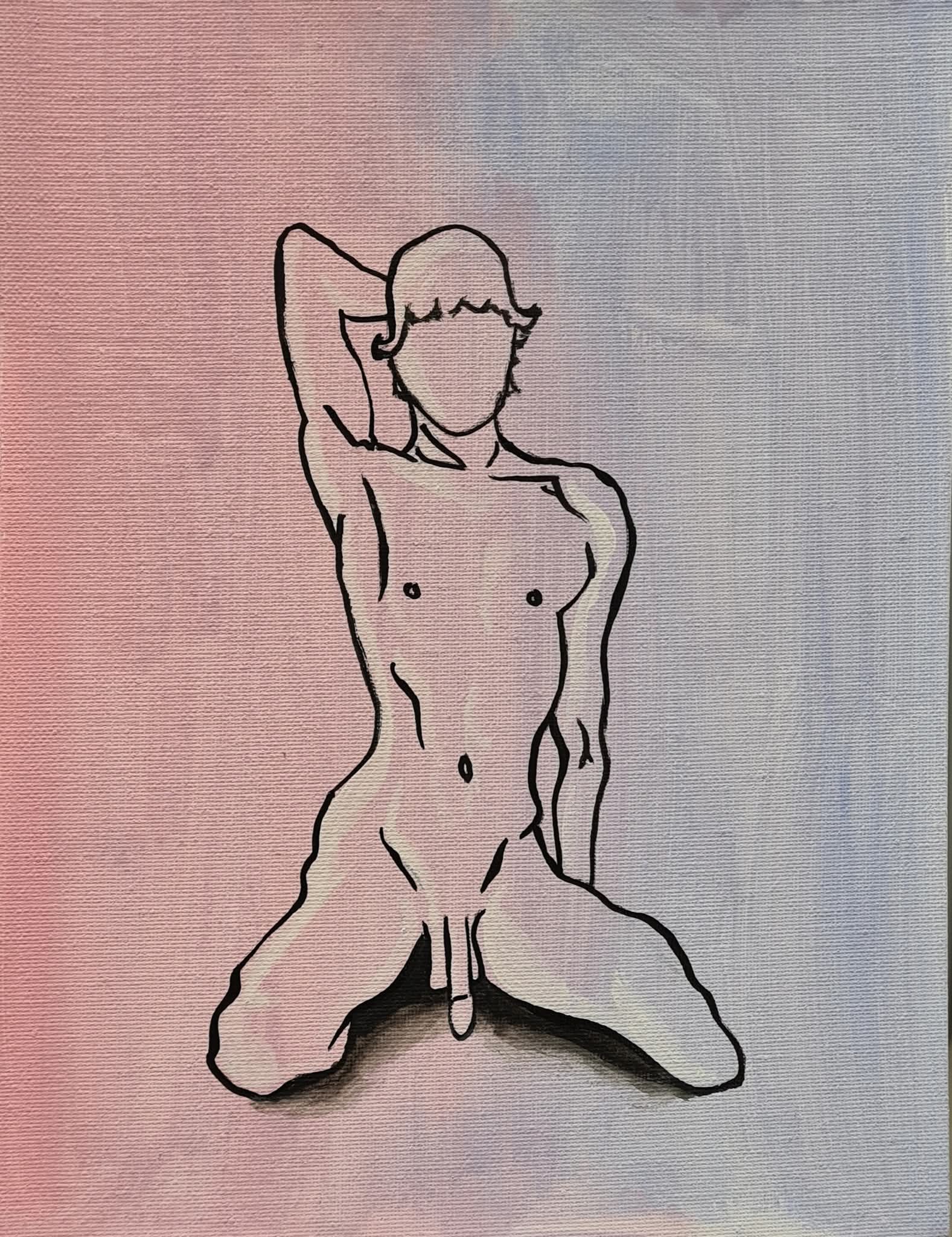 A minimalist male figure rendered with direct, exposed linework against a soft, muted background. The painting examines the body, posture, and presence without idealization, balancing vulnerability and confidence. The interplay between free drawing and subtle color creates a quiet, precise tension, inviting an unmediated and honest contemplation of the human form.