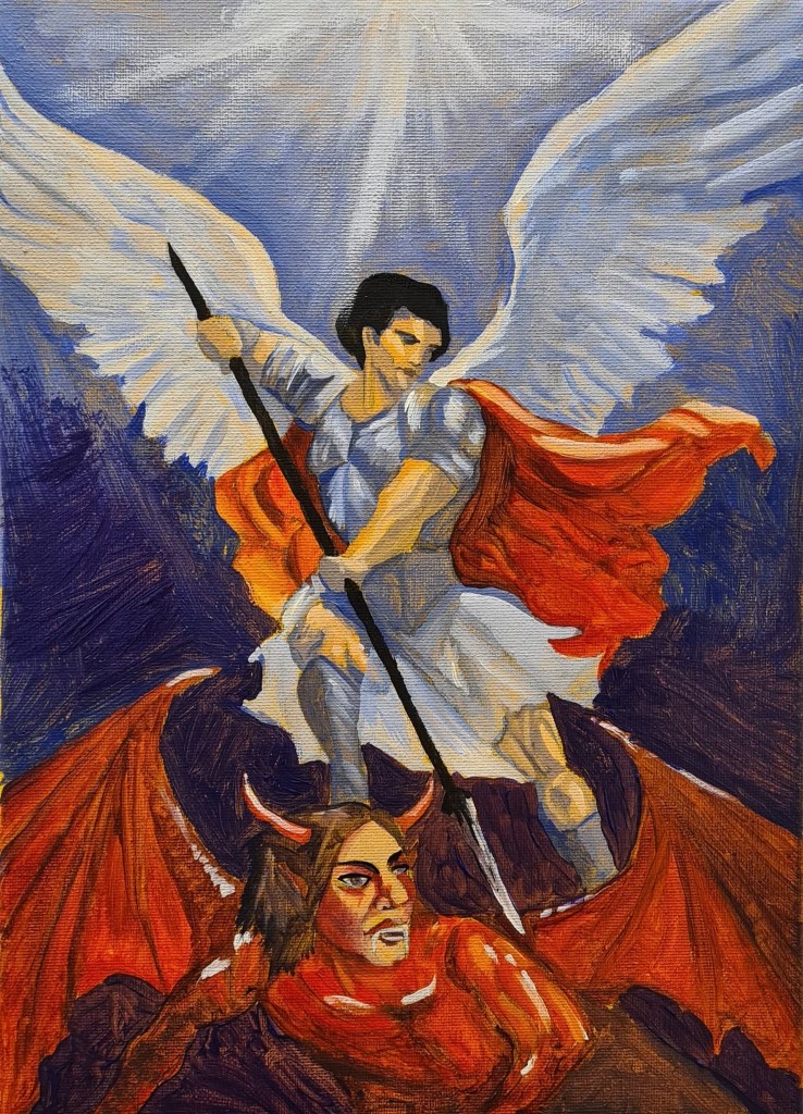 יצירה עוצמתית המתארת את הרגע הדרמטי שבו המלאך מיכאל מכניע את כוחות החושך. הקומפוזיציה הדינמית מדגישה מאבק בין אור לצל, בין סדר לכאוס, כאשר דמותו של מיכאל מוארת מלמעלה, עטופה כנפיים לבנות וסמליות של טוהר, בעוד השטן מתפתל תחתיו בצבעים חמים ואפלים.